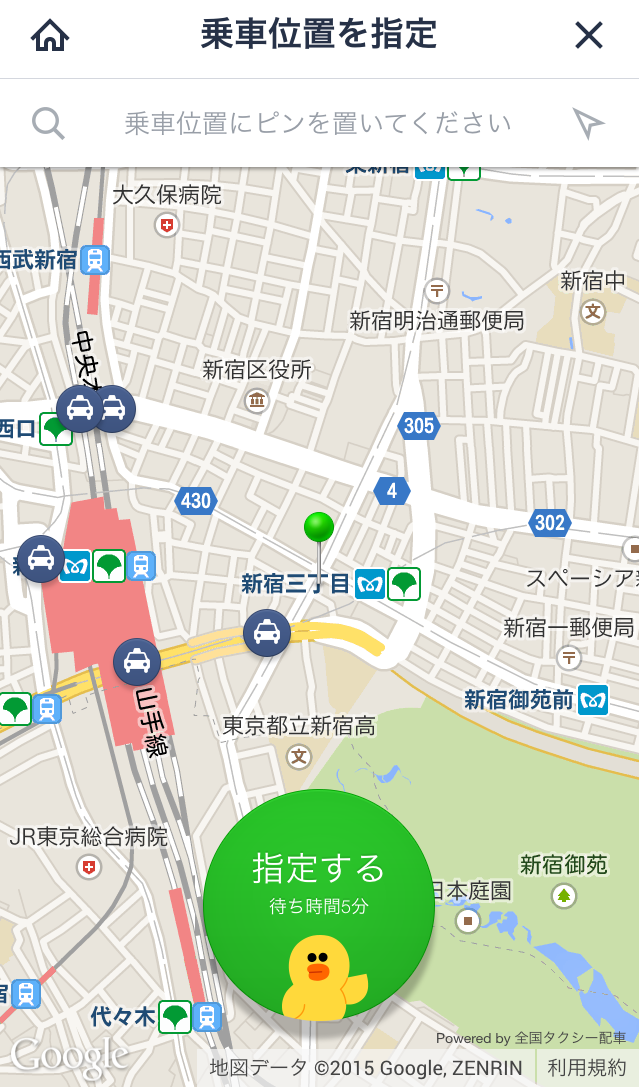 タクシーの呼び出しはマップ上*にて乗車位置を指定するだけでOK。建物名を入力して指定することもできます。